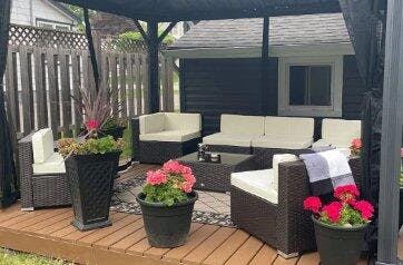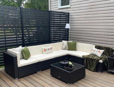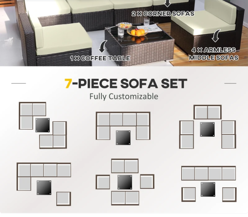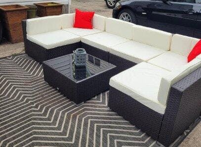 Excellent little set. Perfect addition to our backyard. Easy to put together. Cushions are very slippery and abit thin. But very happy for the price. Excited to get our fire table next. Definitely will be adding my own throw pillows. These ones are quite thin and not great looking. Overall very happy.